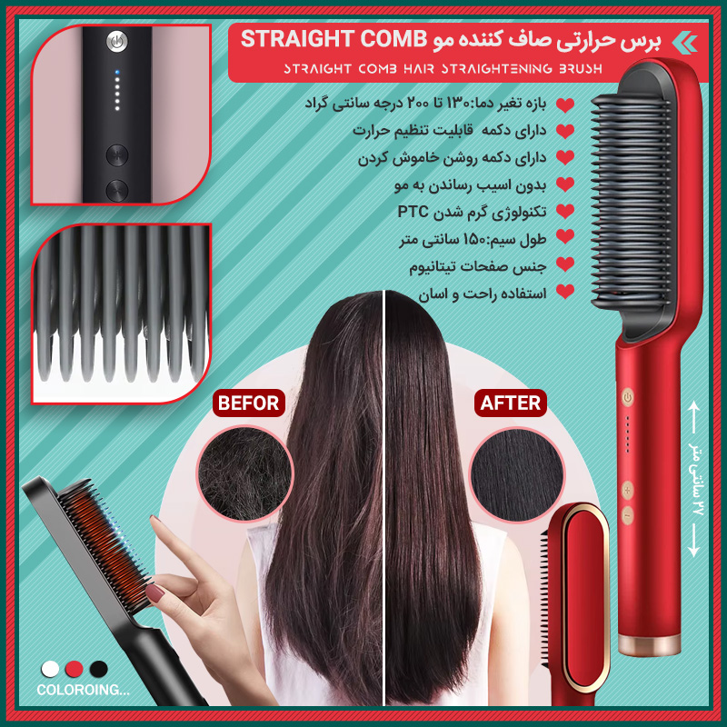 یکی از روشهای داشتن ظاهری زیبا و مرتب، حالت دادن به موها است. هیچ حسی بهتر از این نیست که خودتان بتوانید هنگام بیرون رفتن از خانه، به سر و وضعتان برسید و ظاهری زیبا داشته باشید. اما مگر می توان حالت دهی موها را به تنهایی و در خانه انجام داد؟ امروزه با کمک برس حرارتی صاف کننده مو STRAIGHT COMB، به راحتی میتوانید به چنین خواسته ای برسید. این برس حالت دهنده مو برای داشتن مدل های مختلف به شما کمک میکنند؛ به نحوی که با استفاده از این برس حرارتی همیشه میتوانید موهایی مرتب با مدل هایی متنوع داشته باشید.